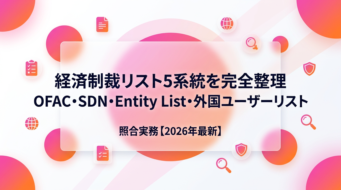 ここまで見てきたとおり、日本企業が抜け漏れなくスクリーニングしようとすれば、最低でも米国のCSL(Consolidated Screening List、13リストを横断検索)、EUのFinancial Sanctions Database、英国のUK Sanctions List、日本の外国ユーザーリスト、国連のConsolidated Listの5系統を同時に照合する必要があります。制裁ではないものの近接する情報として、米国DODのSection 1260Hリスト(中国軍関連企業)、米国CMC(Chinese Military Companies)リスト、NS-CMICリスト、カナダSEMAリスト、オーストラリアDFATリスト、そして自社独自のウォッチリストが現場では並行して使われます。これら全部を人手で更新・照合しようとすると、中堅企業のコンプライアンス部門1〜2名ではまず回りません。