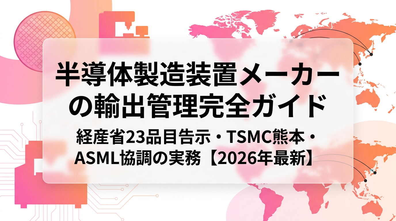 こんにちは、株式会社TIMEWELLの濱本です。半導体製造装置の現場は、この二年で景色が変わりました。2023年に経産省が23品目を貨物等省令に追加してから、東京エレクトロンやSCREENホールディングス、ニコン、キヤノンといった主要プレーヤーは、技術開発と同じくらいの熱量で輸出管理業務に人を張るようになっています。TSMC熊本のJASMが2024年12月に量産を始め、ラピダスがASMLのNXE:3800Eを千歳に搬入した2024年12月以降、国内向け取引にも外為法のややこしさが持ち込まれました。