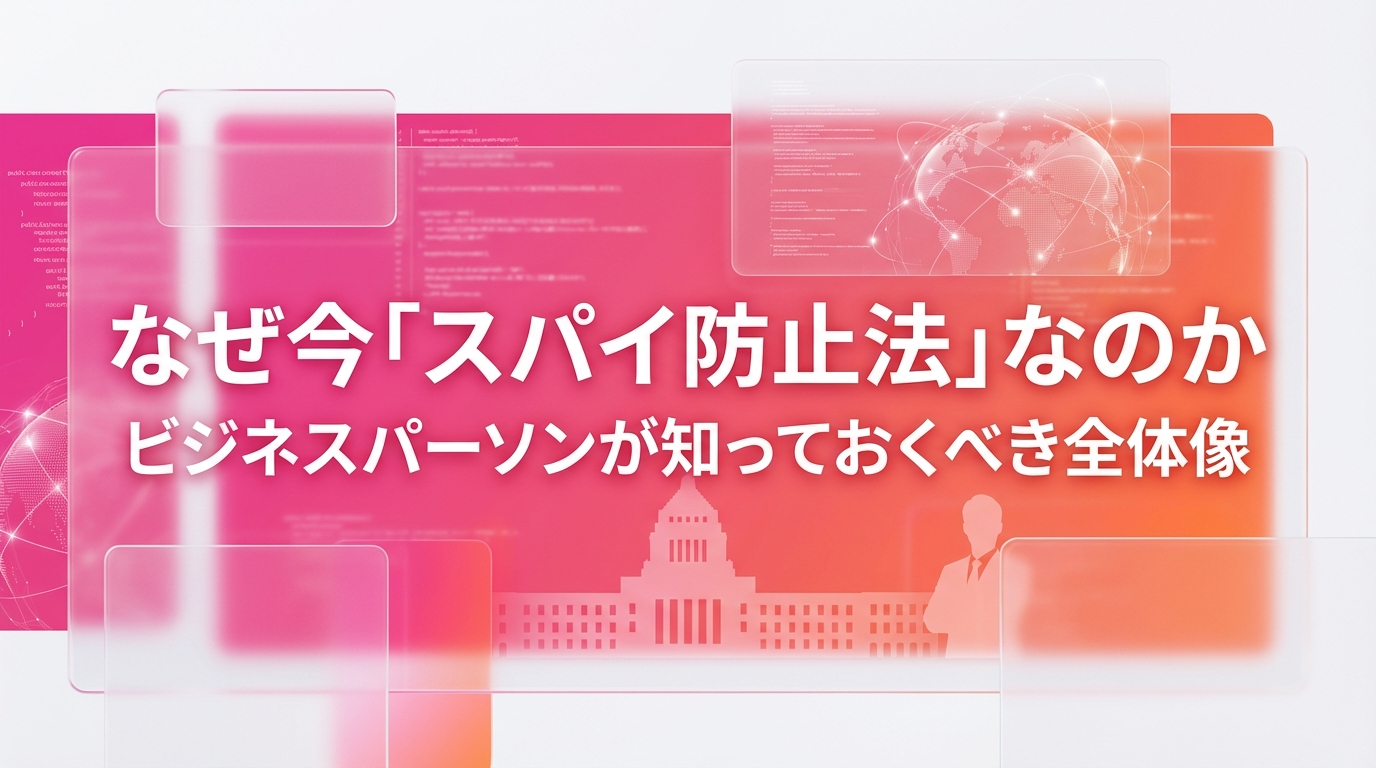最近、ニュースで「スパイ防止法」という言葉を目にする機会が増えました。正直に言うと、私自身も最初は「映画の話でしょ?」くらいの感覚でした。ところが調べれば調べるほど、これはテック業界で事業をやっている人間にとって、かなり身近な問題だと気づかされたのです。