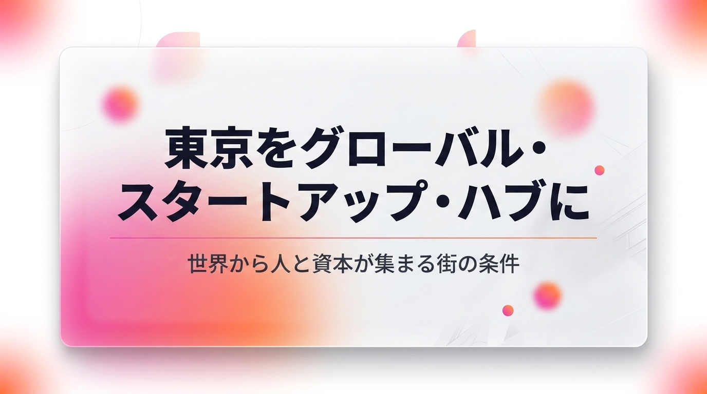加えて、海外起業家を呼び込むための制度・税制・住居の課題も、この10年で大きく動くはずです。経営・管理ビザの改正、Tokyo Innovation Baseのさらなる拡充、国際学校の枠拡大、税制優遇の整備——これらが揃ったとき、東京は名実ともにシンガポール・サンフランシスコ・ロンドンと並ぶ「特化型グローバルハブ」になります。